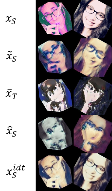 ソースドメイン(ここでは人の顔写真)の画像からターゲットドメイン(ここではアニメキャラクターの顔)の画像へ変換することに取り組んでいる。GANベースで、unpairedでも(画像の間で対応が取れていなくても)変換できるようにGeneratorを学習させる手法を提案している。
