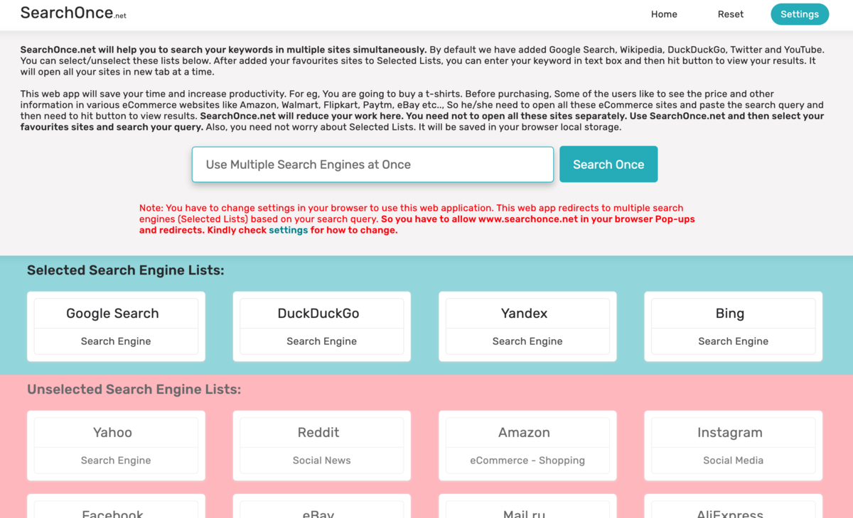 自分のほしいツールとしては、「SearchOnce」というwebサイトがドンピシャだった。使い方は簡単で、キーワードと検索したいwebサイトを選択してボタンを押せば別タブで検索結果を開いてくれる。
