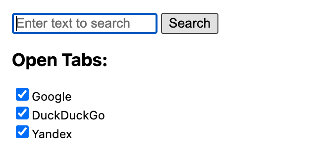 ロジックはシンプルで "https://検索エンジン/q=<キーワード>"というURLを各検索エンジンごとに別タブで開いているだけである。